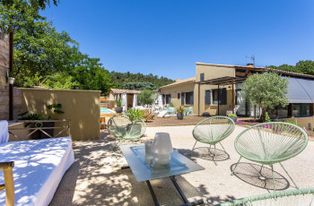 Vous serez enchanté par le jardin clos et arboré d'environ 2700m² qui entoure la maison et qui offre intimité et tranquillité. Les oliviers ajoutent une touche de beauté naturelle, typiquement provençale et créent une atmosphère paisible. La piscine est un havre de détente et de plaisir, où vous pourrez vous prélasser et profiter du soleil en toute intimité. La propriété bénéficie d'une incroyable vue panoramique qui ajoute une valeur exceptionnelle à son cadre. Depuis différents points de la maison et du jardin, vous pourrez contempler un paysage époustouflant qui s'étend à perte de vue.