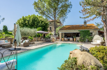 Une magnifique double porte d’entrée en chêne, datant du début du siècle, s’ouvre sur le hall de la bâtisse principale d’une superficie habitable de 264 m2. Cette entrée distribue un grand salon-séjour de 54 m2, ouvrant d’un côté sur une terrasse couverte en pierres sèches, intégrant salon d’été et cuisine équipée, parfaite pour vos soirées estivales entre amis, et de l’autre côté sur une grande cuisine contemporaine, entièrement et luxueusement équipée, avec cellier accolé. On trouve aussi à ce niveau une chambre parentale avec salle de bains et wc, un bureau, de nombreux rangements et local technique.